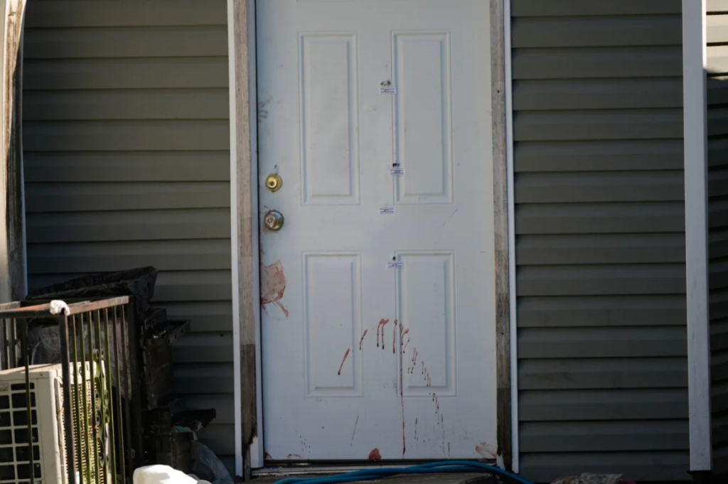 Una puerta que parece estar manchada de sangre y marcadores de evidencia permanece cerrada en el exterior del lugar de un tiroteo masivo, el domingo 19 de abril de 2026, en Shreveport, Luisiana. Gerald Herbert/AP.