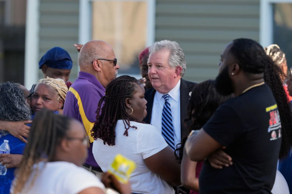 El alcalde de Shreveport, Tom Arceneaux, habla con las personas reunidas en las afueras del lugar de un tiroteo masivo, el domingo 19 de abril de 2026, en Shreveport, Louisiana. Gerald Herbert/AP.