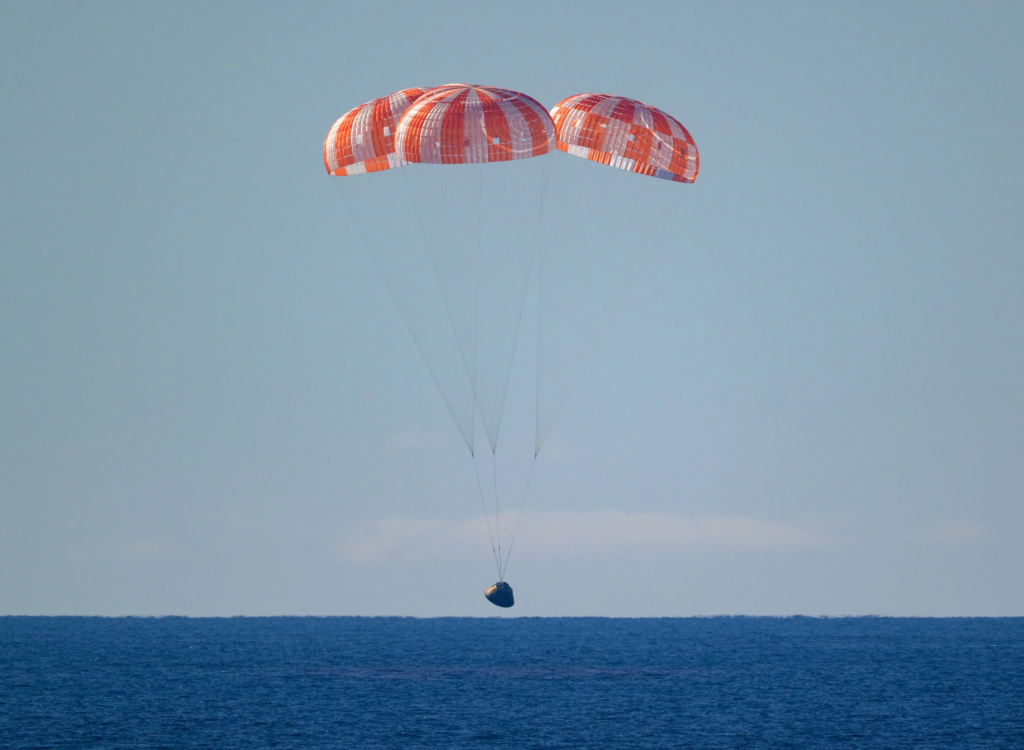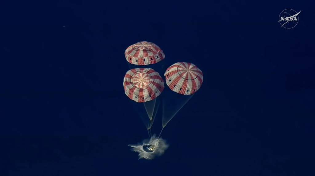 Tras superar los angustiantes minutos de bloqueo de comunicaciones causados por el plasma, los paracaídas se desplegaron exitosamente. Este sistema de frenado redujo drásticamente la velocidad de la cápsula a solo 32 kilómetros por hora antes de tocar suavemente el agua.