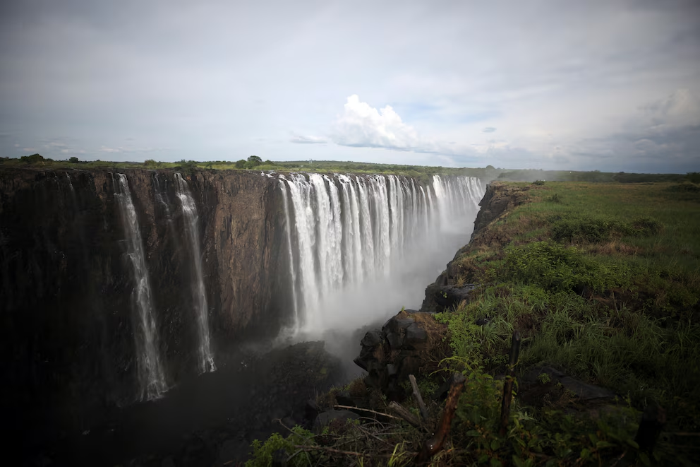 El nombre indígena de este lugar significa “el humo que truena”, debido a la columna de vapor que se eleva a cientos de metros. El entorno forma parte de un parque nacional que sirve de santuario para el rinoceronte blanco y el elefante africano bajo una lluvia constante producida por la propia catarata.