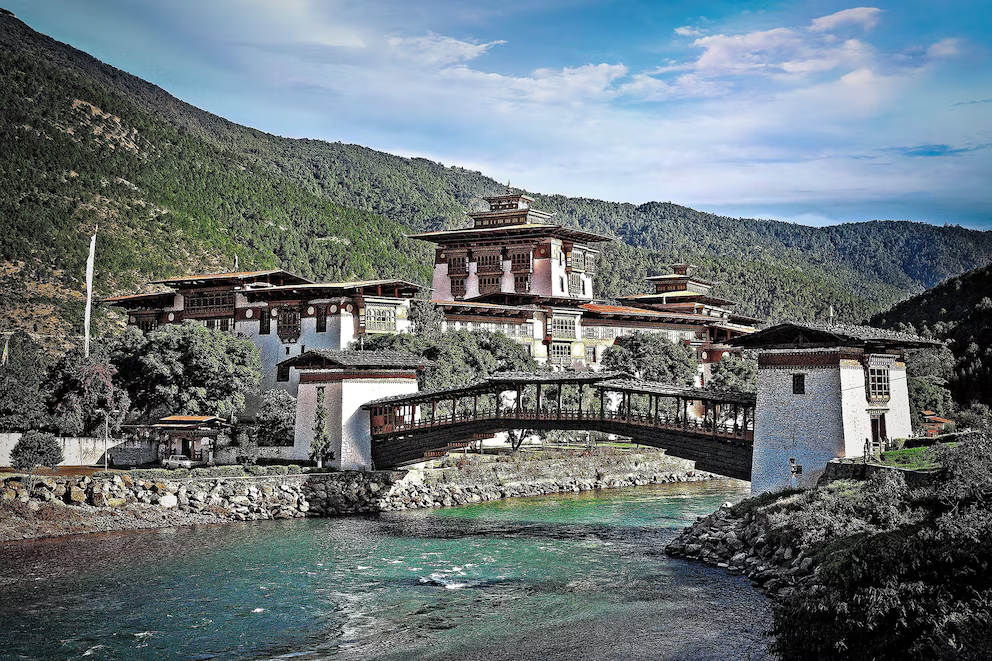 El Valle de Punakha en Bután disfruta de clima templado en el Himalaya y su puente colgante permite cruzar entre campos de arroz y banderas de oración (Grosby Group).