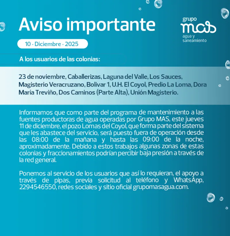 En ese aspecto, el Grupo MAS puso a disposición un número de teléfono y WhatsApp, para que los usuarios que así lo deseen puedan pedir el apoyo en el suministro de agua por medio de pipas, además de en sus redes sociales y a través de su sitio oficial.