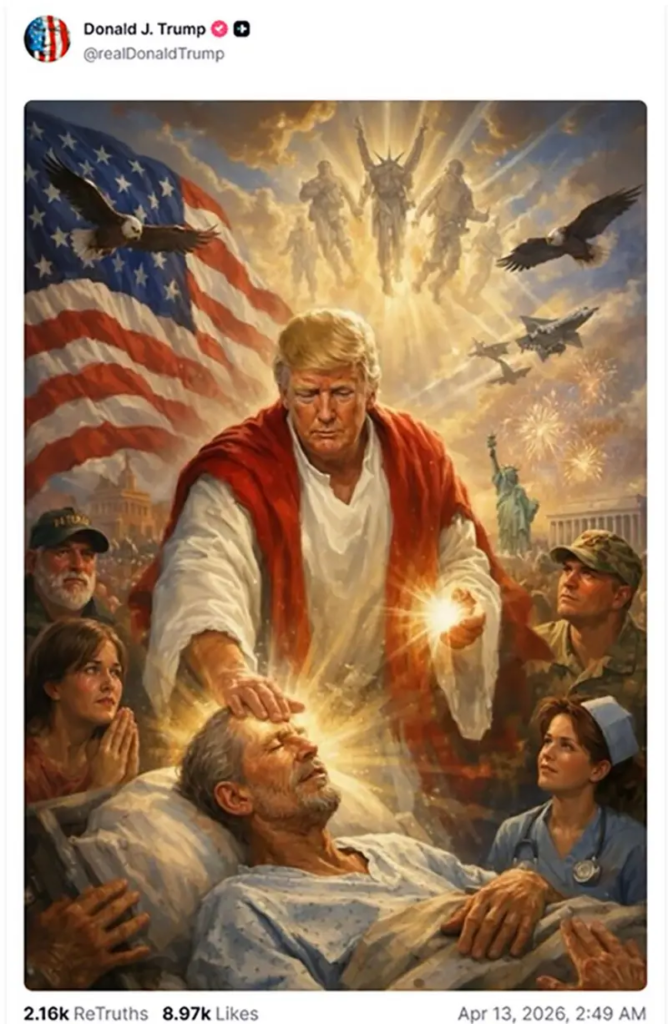 Luego, el republicano publicó una imagen ampliamente identificada como generada por inteligencia artificial en la que se le ve como una figura similar a Jesús que parece “sanar” a un hombre, un gesto que atrajo críticas de líderes religiosos y comentaristas.