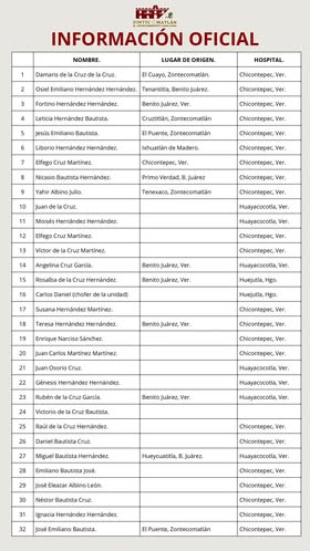 El ayuntamiento de Zontecomatlán difundió una lista de 32 personas heridas que viajaban en el autobús y los hospitales donde son atendidas